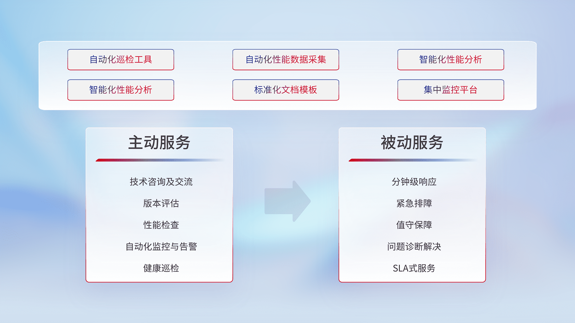 智能化工具和标准化文档,,,保障服务质量,,,,提供主动服务(包含技术咨询、、版本评估、、、性能检查、、自动化监控与告警、、健康巡检)和被动服务包含(分钟级响应、、、、紧急排障、、、、值守保障、、问题诊断解决、、、SLA服务)。。