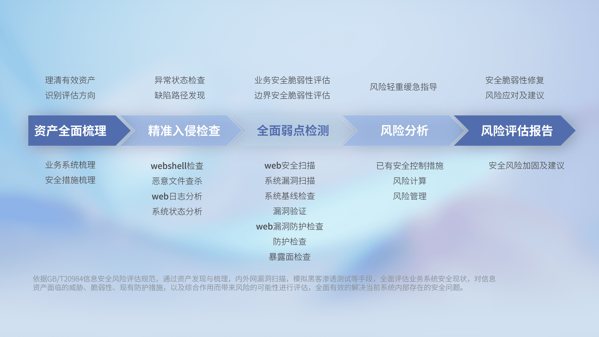 针对客户行业特性,,以专业的安全服务+多厂商联合解决方案提供专属的一站式安全管理服务,,帮助客户全面感知网络空间威胁,,,基于识别、、、、检测、、、、分析、、防护、、监测、、、、响应的服务理论模型,,从方案咨询、、、、集成交付、、评估验证、、、优化加固、、运维运营,,致力于为客户提供完整的闭环管理式安全服务。。。以实战经验为客户打造高抵御风险的安全体系,,,,帮助客户发现威胁、、对抗威胁、、、、处置威胁,,,不断积累安全对抗能力,,持续保障数字化安全。。。。